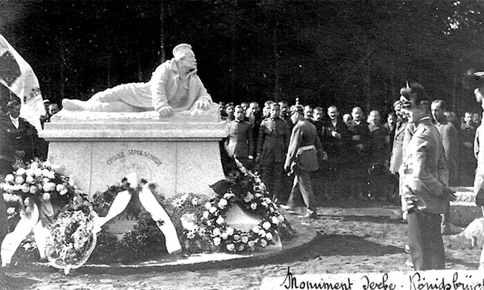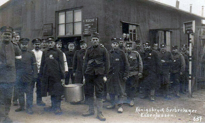 Српски ратни заробљеници долазе у Кенигсбрик у периоду јануар–мај 1916. године, углавном из логора Браунау ин Бемен. Припадници сваке нације понаособ били су распоређени у засебном делу логора и нису долазили у контакт са осталима. У септембру 1918. српски заробљеници су на гробљу подигли споменик својим преминулим друговима у овом логору. Сличне споменике подигли су и припадници осталих нација интернираних.